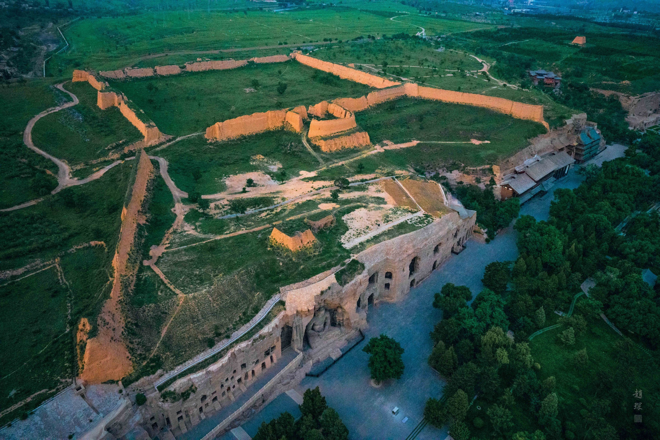 云岡堡,位于云岡石窟西部石窟前,即下堡;后由于御敵需要于萬歷年間上移,即為上堡。云岡堡特點鮮明。下面是石窟,上面是長城。目前崖下連墻已無且下堡坍塌嚴重,上堡相對完整但堡內也已夷為平地,窟頂連墻保存較好,呈八字形。